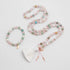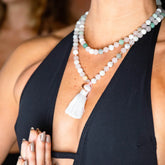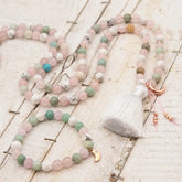 "Collar de meditación de Amazonita, Howlita y Cuarzo Rosa   con borla de seda blanca y detalle de Luna de Yogimi."