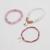 Pulsera de yoga de Piedra Lunar, Cuarzo Rosa y Ágata Blanca con detalle de medalla de yoga en plata de Yogimi.